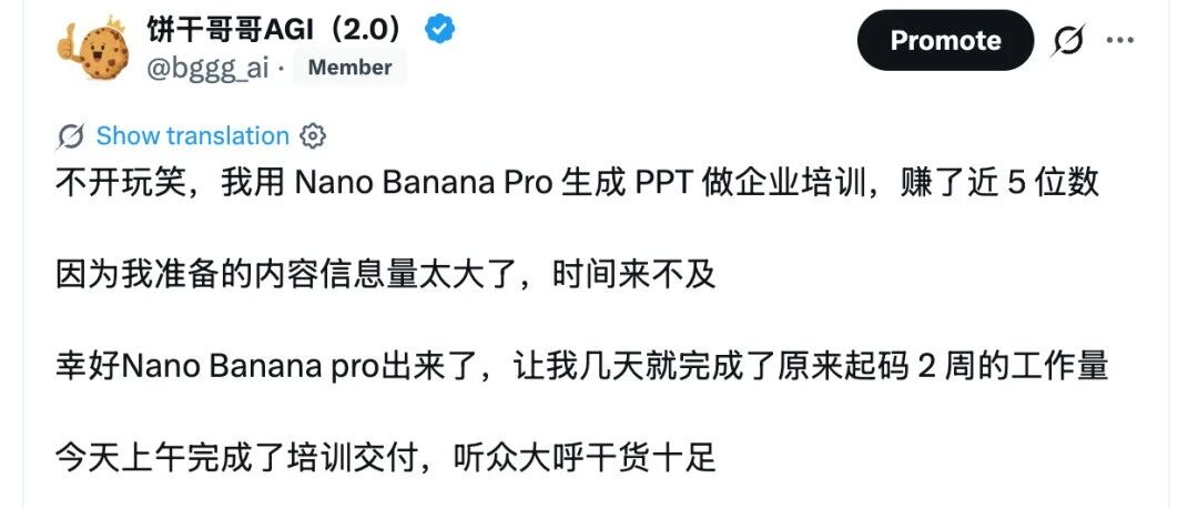 View quoted post1/4 不开玩笑,我用 Nano Banana Pro 生成 PPT 做企业培训,赚了近 5 位数 因为我准备的内容信息量太大了,时间来不及 幸好Nano Banana pro出来了,让我几天就完成了原来起码 2 周的工作量 今天上午完成了培训交付,听众大呼干货十足 至此,我已跑通用 Nano Banana Pro做 PPT 的最佳落地实践 🧵2/4 先晒一下客户反馈,今天上午讲完后,说干货十足,虽然被看出来了AI 生成,但不影响效果很好 接下来复盘一下我是怎么做的3/4 1. 按模板生成提示词 首先,nano banana 的默认画风太华丽了,根本不适合商业场景下使用。 而我们个人或者企业都是有固定模板的,所以这里解决方案就明显了,把默认PPT 转成10 张图片,喂给 gemini,让它总结出模板风格,形成 Nano Banana 生图的提示词4/4 2. 根据培训大纲生成含PPT描述的教案 这一步是关键,我们要的 PPT 不是单独一页的,而是前后关联,逻辑层层递进的,而且 PPT 里的每个元素都有它的作用,培训的时候都要讲的 所以一定要打磨好培训大纲,琢磨清楚每页要有什么内容,当然这步也可以让 AI 帮忙 然后一定是要把含PPT描述的教案扔给Nano Banana,至少是某个模块,一次性生成多张,这样才是连续剧 我的解决方案是在 Lovart 里一次性跑多张,出图很丝滑 3. 参考提示词: 根据下面这个文章做一套中学生都能理解的PPT。 先写1个PPT大纲,规划出每一页的PPT的内容。 然后将每一页的PPT内容分别扔给Nana Banana pro生成对应页面的PPT,需要确保风格一致。 PPT 具体的风格: ``` 【第一步生成好的模板风格】 ``` 文字和图像都由 Nano Banana Pro 生成,另外不要将PPT 变成一整张图,一页一张生成。 文章内容为: ``` 【第二步生成好的教案内容】 ``` 至此,得到的图几乎就能直接用了,最多是改一下尺寸,黏贴到 PPT 模板里,风格一致,没有破绽